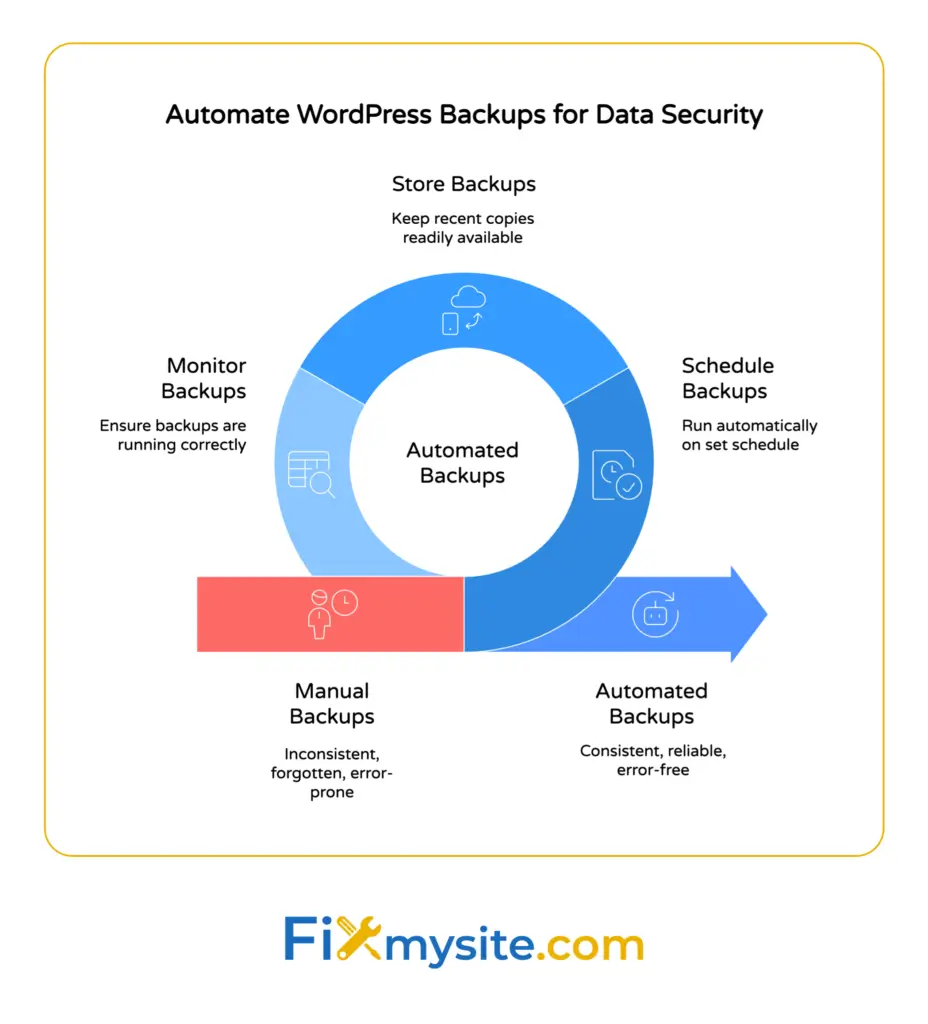 Manual backups fail because people forget. You intend to back up your site weekly, but life gets busy. Before you know it, six months have passed with no backup at all.